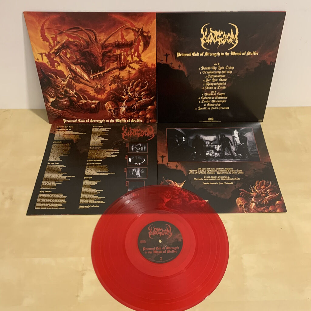 200x bloodred 12" (140g) in a microtene innerbag, printed innersleeve, full-color on 220g carton (coated paper), download card, simple jacket, full-color printed on 350g carton, coated paper (semi-gloss), all assembled in a plastic overbag.